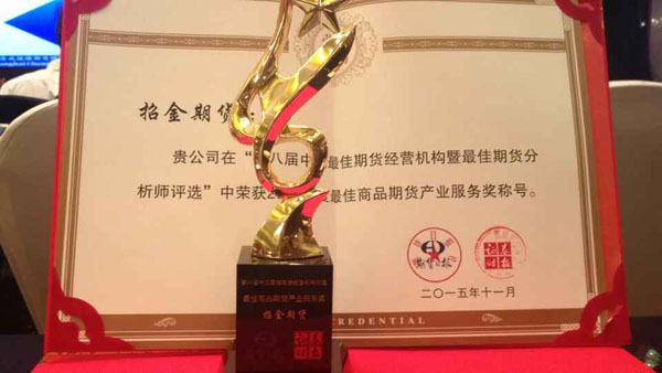 2015年11月13日,在由《證券時(shí)報(bào)》、《期貨日報(bào)》聯(lián)合主辦的“第八屆中國最佳期貨經(jīng)營機(jī)構(gòu)暨最佳期貨分析師評選”中,招金期貨榮獲“中國最具成長性期貨公司”、“最佳資產(chǎn)管理業(yè)務(wù)獎”、“最佳商品期貨產(chǎn)業(yè)服務(wù)獎”、“中國期貨優(yōu)秀營業(yè)部-招金期貨有限公司臨沂營業(yè)部”稱號,同時(shí)招金期貨分析師李曉杰、袁帥榮獲“最佳工業(yè)品期貨分析師”,這是業(yè)界對招金期貨近幾年快速發(fā)展的高度褒獎。 據(jù)悉,"中國最佳期貨經(jīng)營機(jī)構(gòu)暨最佳期貨分析師評選"已成功舉辦八屆,是國內(nèi)設(shè)立最早、行業(yè)中最權(quán)威和最具影響力的評選活動.