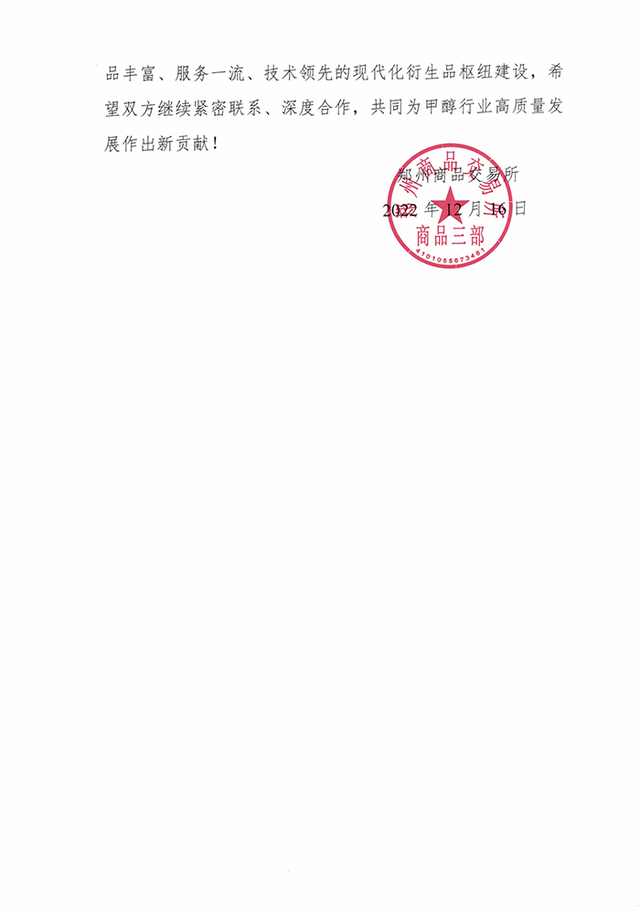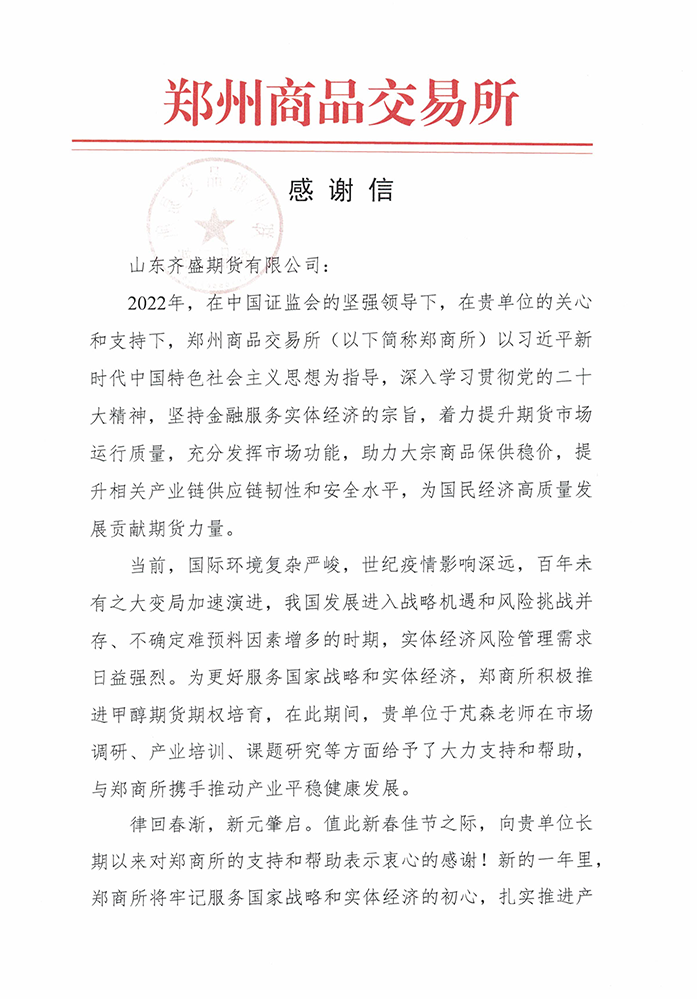 近日,山東齊盛期貨有限公司收到了鄭州商品交易所的感謝信。信中對2022年我司高級分析師于芃森在市場調(diào)研、產(chǎn)業(yè)培訓、課題研究等方面給予了大力支持和幫助,為甲醇期貨相關工作的開展提供了有力保障表示了感謝,并一次性獎勵我司2萬元資金。