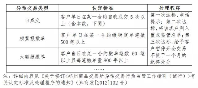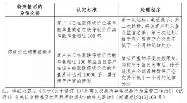 此外,當(dāng)某一合約漲?;蛘叩:?,客戶在漲停板或者跌停板價(jià)位頻繁報(bào)撤單,有不以成交為目的的嫌疑,而且會(huì)對(duì)其他投資者的判斷產(chǎn)生影響,對(duì)正常交易造成干擾。因此,交易所對(duì)某個(gè)交易日某一合約停板后,客戶的頻繁報(bào)撤單行為,同樣制定了相應(yīng)的認(rèn)定標(biāo)準(zhǔn)和處理程序。(詳見(jiàn)下表)