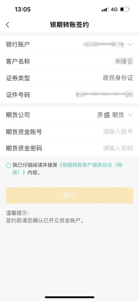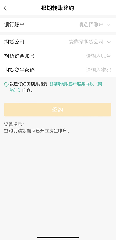 點(diǎn)擊“銀期轉(zhuǎn)賬簽約”,選擇預(yù)留在山東齊盛期貨公司的銀行賬戶,期貨公司填寫為“齊盛期貨”,填寫“期貨資金賬號”和“期貨資金密碼”, 勾選“我已仔細(xì)閱讀并理解《銀期轉(zhuǎn)賬客戶服務(wù)協(xié)議》(網(wǎng)絡(luò))內(nèi)容”,點(diǎn)擊“簽約”。