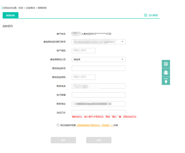 選擇期貨公司,輸入資金賬號、密碼等信息,勾選“我已閱讀并同意”,點(diǎn)擊提交。