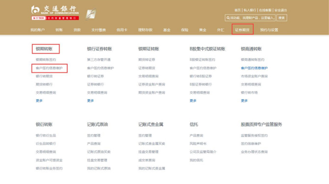 登錄個人網(wǎng)上銀行,選擇“證券期貨”-“銀期轉(zhuǎn)賬”-“客戶簽約信息維護(hù)”。