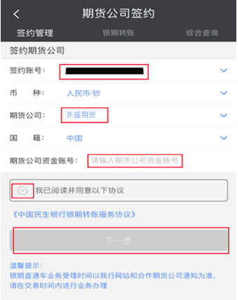 在期貨公司簽約頁面中簽約賬號下拉框中選擇需要簽約的賬號-期貨公司選擇:“齊盛期貨”-期貨公司資金賬號:“輸入資金賬號”-選擇我已閱讀并同意以下協(xié)議并按確認進行簽約。。