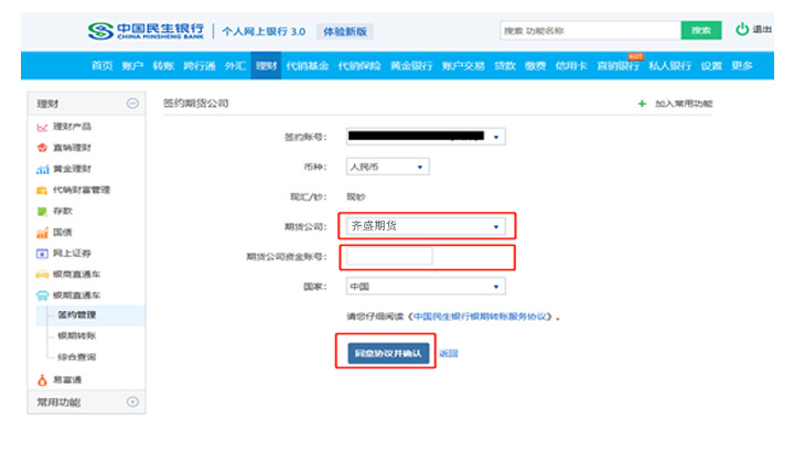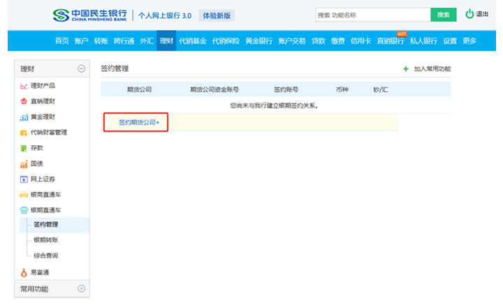 點擊菜單“投資理財—銀期直通車—簽約管理”。