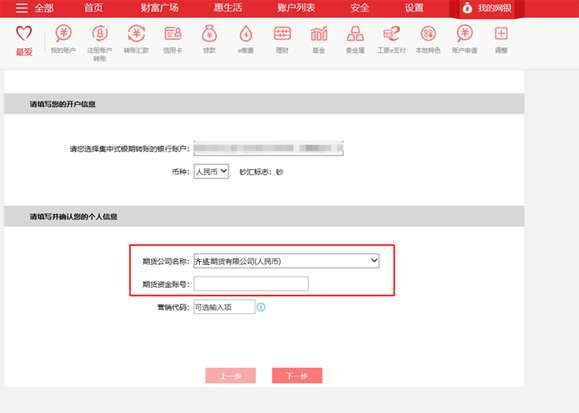 選擇期貨公司,填寫資金賬號(hào)等信息后,點(diǎn)擊“下一步”。