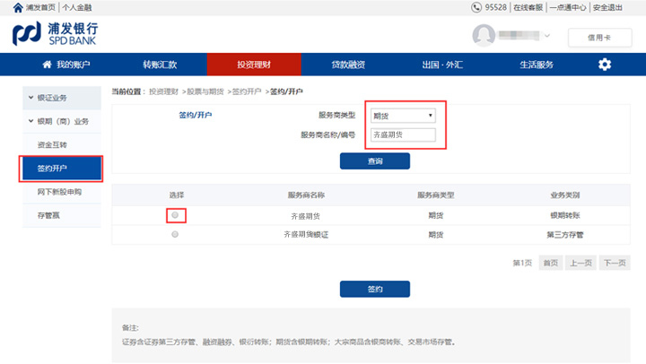 點(diǎn)擊簽約開(kāi)戶(hù),服務(wù)商類(lèi)型選擇“期貨“,服務(wù)商名稱(chēng)選擇”齊盛期貨“,并在底下選擇選項(xiàng)上勾選下,再點(diǎn)擊”簽約“。